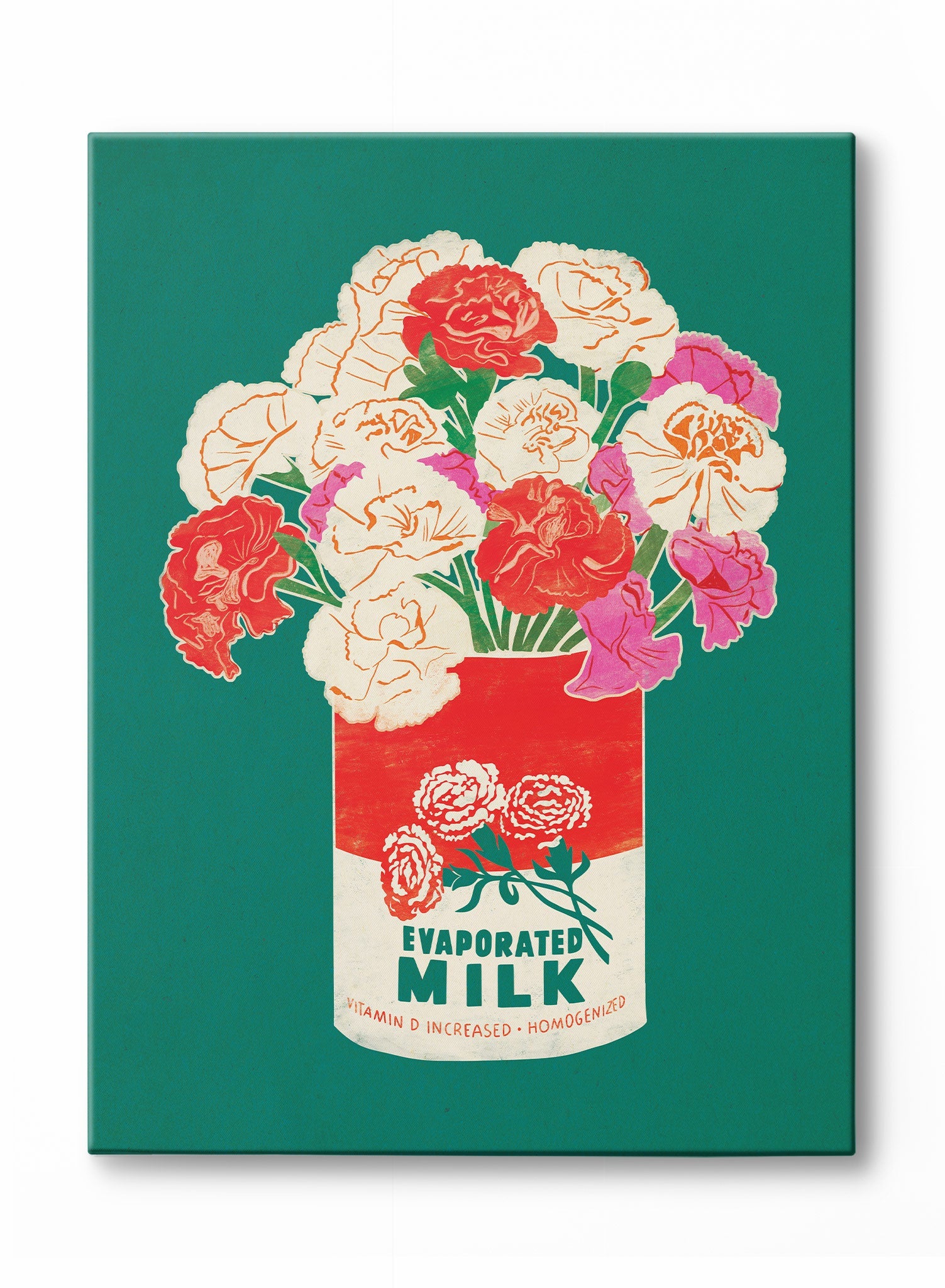 This vintage illustration is composed of a lush white and pink flower bouquer in a can of evaporated milk over a green background.